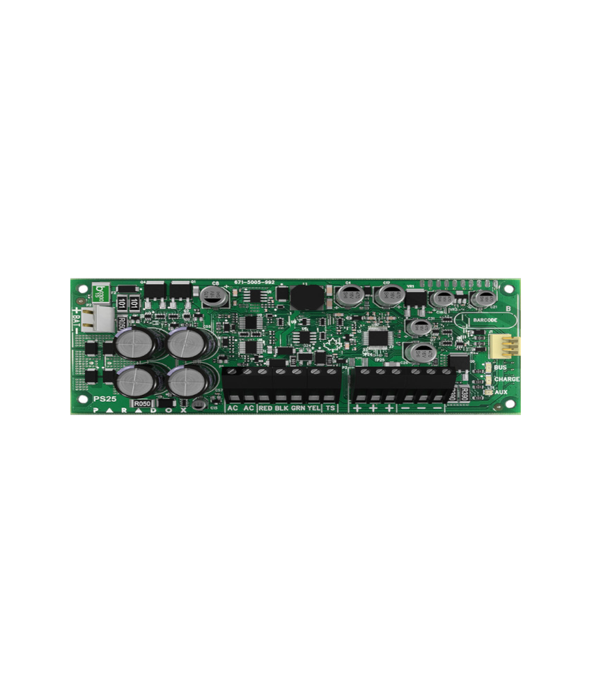 Módulo de Alimentação 12V 2.5 Amp. Supervisão de corrente alterna, bateria, bateria baixa e limite auxiliar. 1 saída PGM. Centrais Paradox V6.80 ou superior.